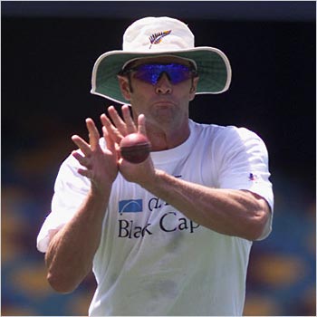 Kiwi all-rounder Chris Cairns trying to grab a ball at the training session.