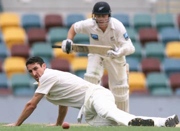 Jason Gillespie attempts to field his own bowling.