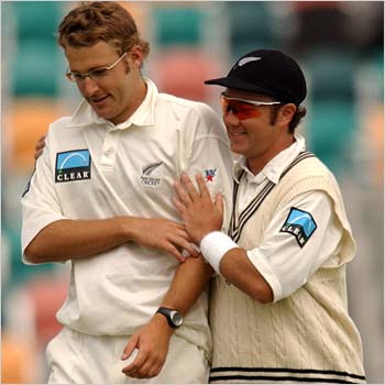 Daniel Vettori gets a pat from team mate Craig McMillan. The left arm spinner dismissed Hayden (91), Mark Waugh (12) and Damien Martyn (0) in an inspiring performance after the openers had hit him out of the attack earlier in the day.