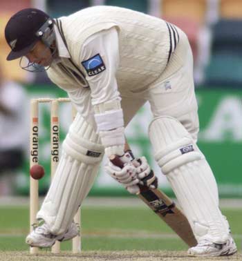 Craig McMillan digs out a yorker from Brett Lee. McMillan went on to make 55.
