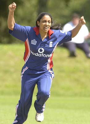 England's 17-year-old seam bowler Isa Guha celebrates taking her first wicket for England in her debut match. She finished with figures of 2 wickets for 17 runs.